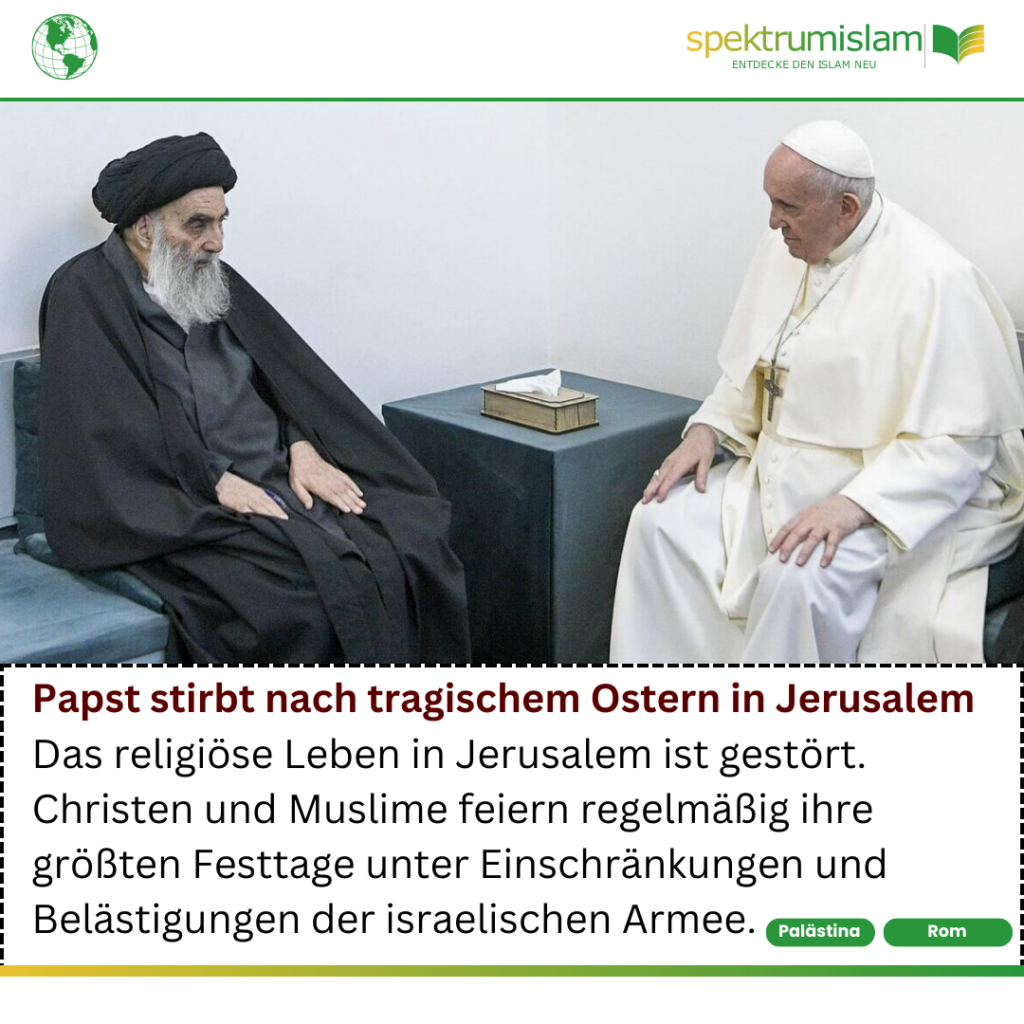 Papst Franziskus wird sich zu dieser tragischen Ostersituation in Palästina nicht äußern. Der Geistliche, der bekannt dafür war, den Armen nah zu sein, interreligiöse Dialoge durch Treffen mit führenden islamischen Gelehrten wie Sayyid as-Sistani im Irak3 oder Großimam Ahmed al-Tayeb zu führen, verstarb am heutigen Morgen (21. April 2025).4 Seine kritischen Worte gegenüber Israel, deren Vorgehen in Gaza er als einen möglichen Völkermord bezeichnete, sorgten für Spannungen mit Israel. Der israelischen Führung gefiel der Ton des Kirchenoberhauptes gar nicht und bestellte im Dezember sogar den Vertreter des Vatikans ein, um ihre Empörung über die scharfen Worte des Pontifex darzulegen. Während des Krieges rief er täglich die katholische Kirche in Gaza an, um sich über den aktuellen Stand zu informieren und Gebete weiterzugeben.5 In seinem letzten Wort zum heiligen Tag rief er am Sonntag zu einer Feuerpause und einem Ende des Krieges auf. Nun wird jedoch erstmal das kritische Wort aus dem Vatikan verstummen. Die katholische Kirche wird sich nun der Trauer und der Findung eines neuen Oberhauptes widmen.